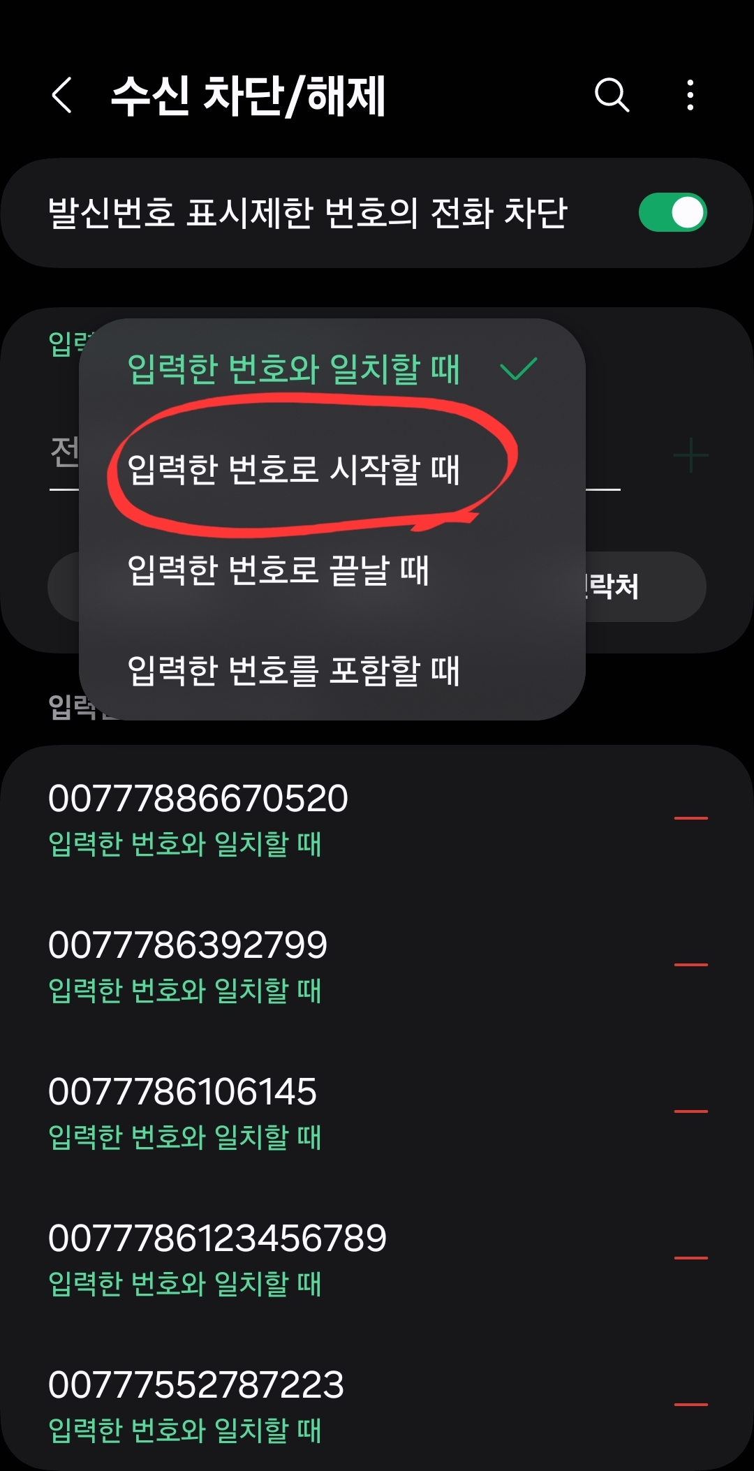 4. 입력한 번호와 일치할 때 클릭 -> 입력한 번호로 시작할 때 선택